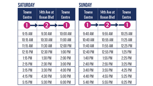 El sábado, actualmente está programado que funcione aproximadamente cada hora, comenzando a las 9:15 a. m. y terminando a las 5:30 p. m., hora a la que sale el último transbordador de la playa.